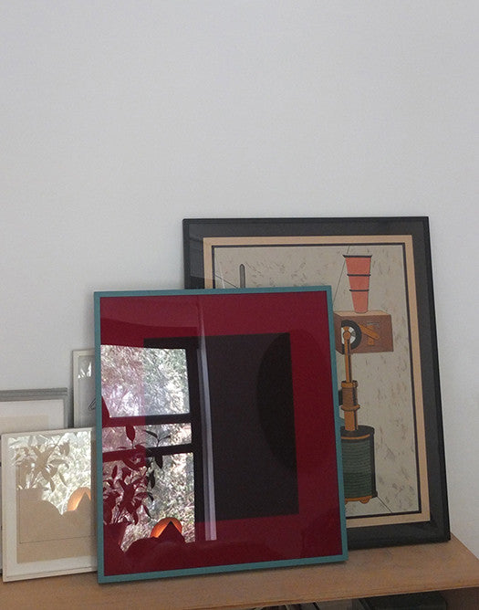 Paying homage to the work of fellow artist Barbara T. Smith, Matt Connor’s edition for The Song Cave takes the metaphoric action “to reflect” literally, and focuses his camera upon the shimmering reflections found on the surface of one of his own paintings. By revealing its domestic surroundings and a glimpse of the trees and sky beyond it, Connors’ photograph multiplies and layers his notions of reflection and reverence into a poetically elegant and striking still life.
