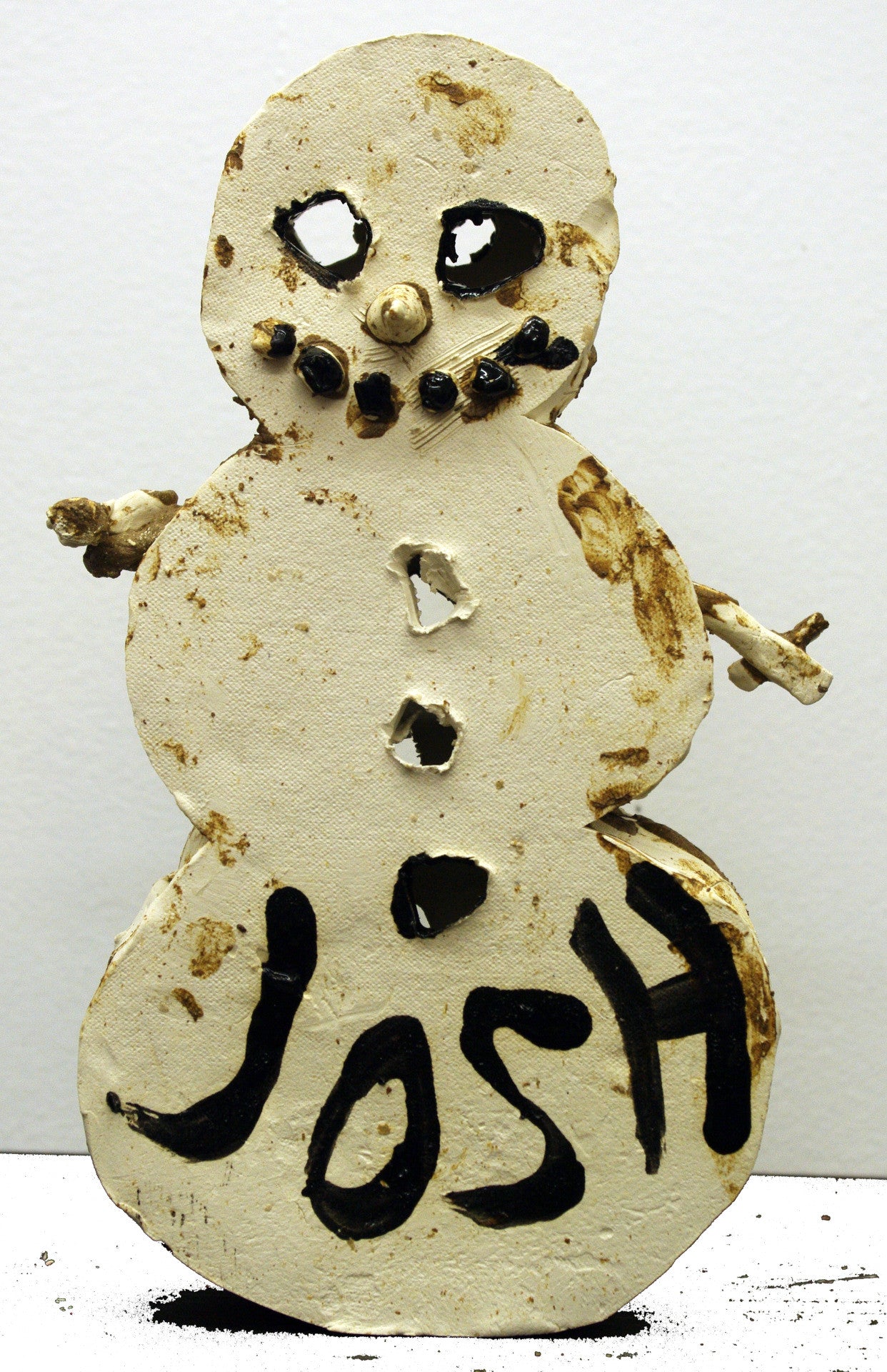 In the edition that Josh Smith has made for The Song Cave, he offers us the image of a ceramic snowman resting in a field of digitized snow. “Josh” scrawled across its dirty bottom. A self-contradictory symbol of sweet impermanence frozen in the process of self-creation, or self-portrait made of snow? Either way, this deadpan stand-in announces its arrival into Smith’s oeuvre with a self-knowing grin.