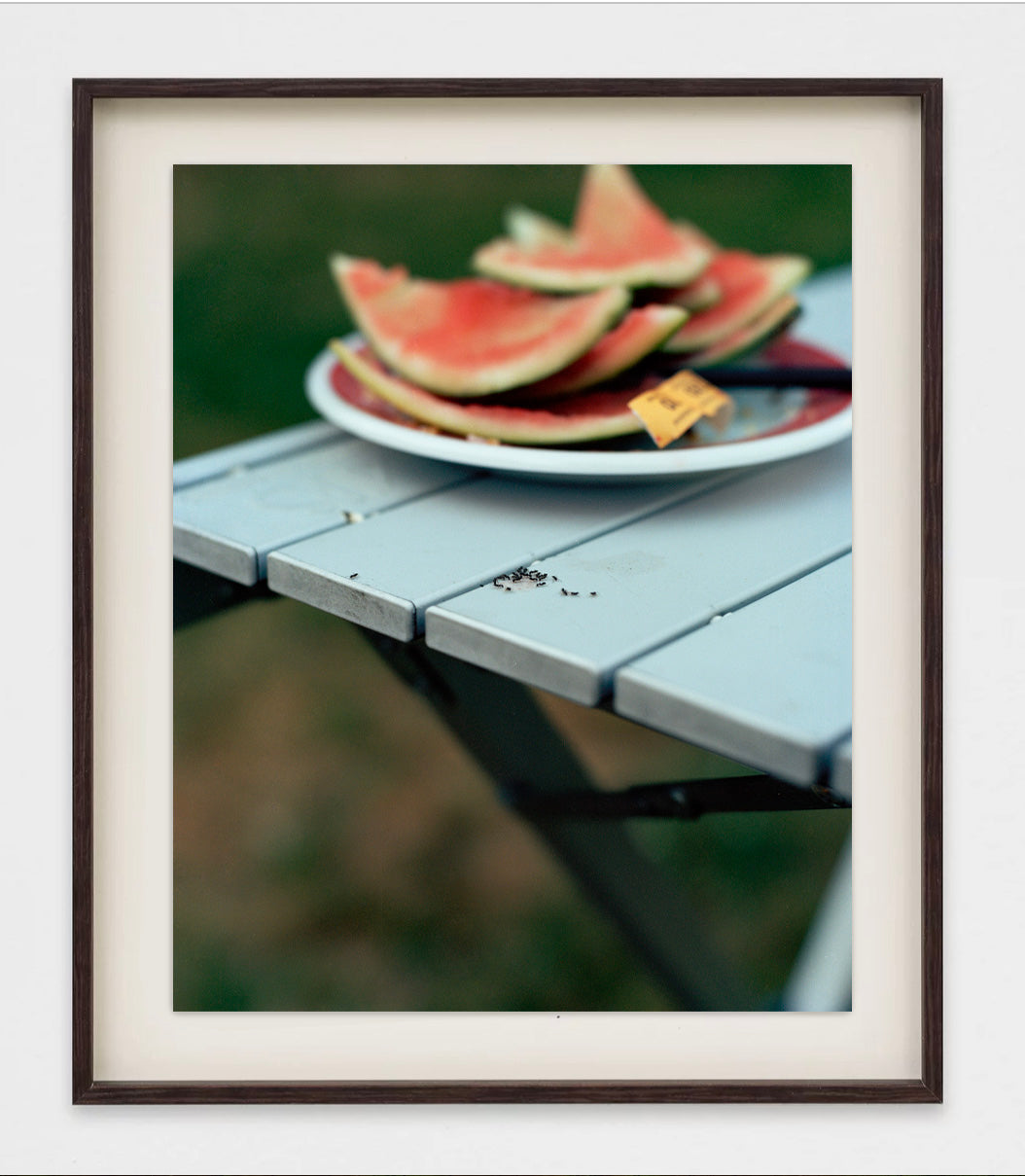 "Ants on the picnic table, around a drying puddle of watermelon juice; one wanders off toward the edge. On a plate sits the watermelon carcass Danny and I had eaten earlier that afternoon, as well as the wrapper of film opened to make this photograph."